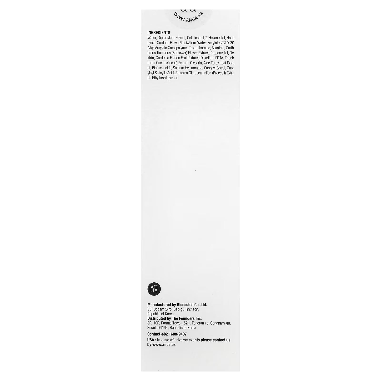 Water, dipropylene glycol, cellulose, 1,2-hexanediol, houttuynia cordata flower/leaf/stem water, acrylates/c10-30 alkyl acrylate crosspolymer, tromethamine, allantoin, carthamus tinctorius (safflower) flower extract, propanediol, dextrin, gardenia florida fruit extract, disodium edta, theobroma cacao (cocoa) extract, glycerin, aloe ferox leaf extract, bioflavonoids, sodium hyaluronate, caprylyl glycol, capryloyl salicylic acid, brassica oleracea italica (broccoli) extract, ethylhexylglycerin.
