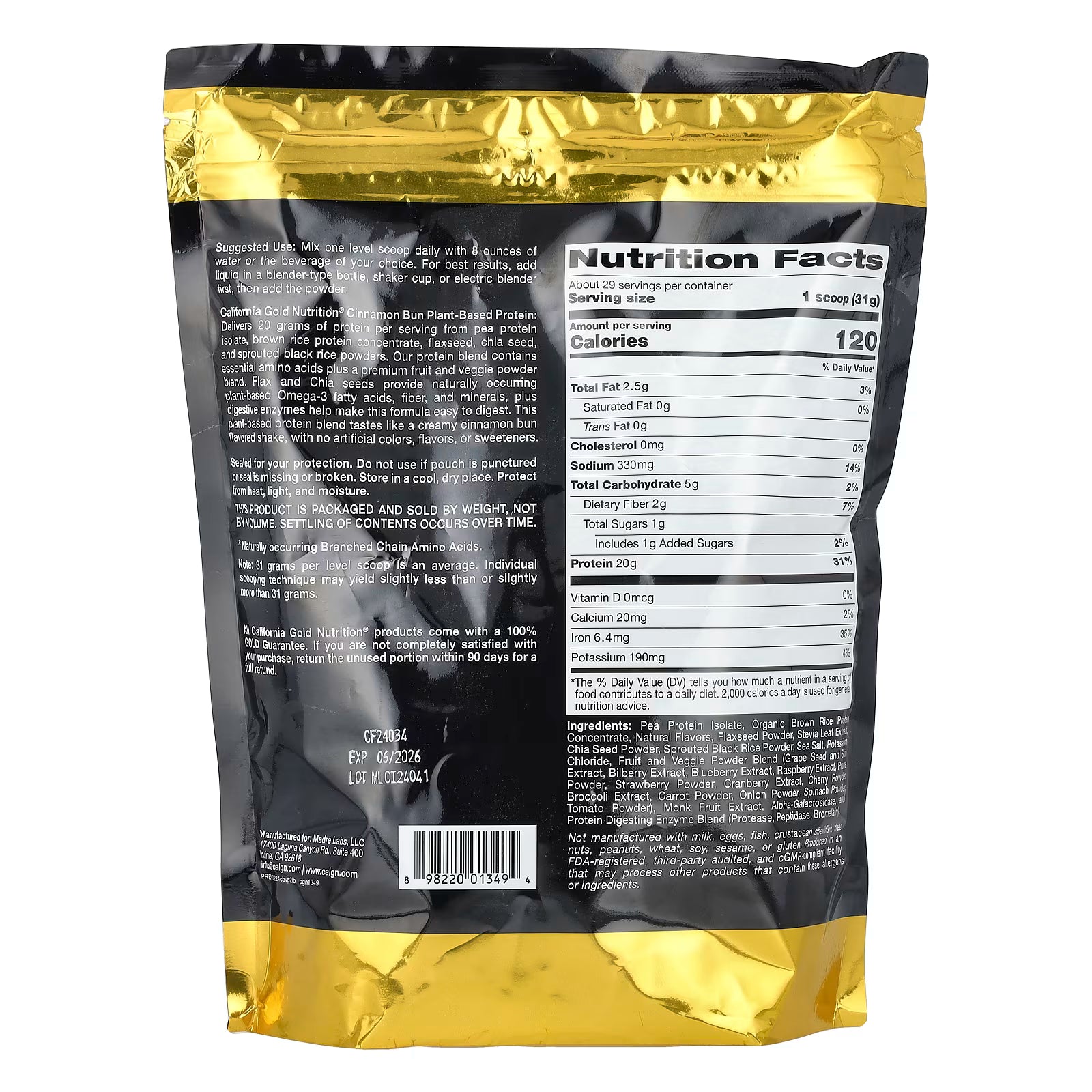 California Gold Nutrition® Sport Plant-Based Protein contains protein and amino acids from entirely plant-based sources. It is naturally flavored to create a delicious, creamy, cinnamon bun flavored shake.