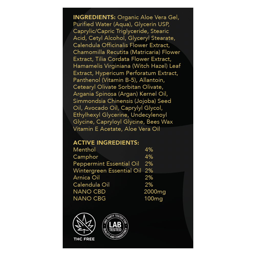 Organic Aloe Vera Gel, Menthol, Camphor, Peppermint, Wintergreen, Arnica, Calendula, NANO CBD, and NANO CBG are all known for topical pain relief due to their individual and combined therapeutic properties.
