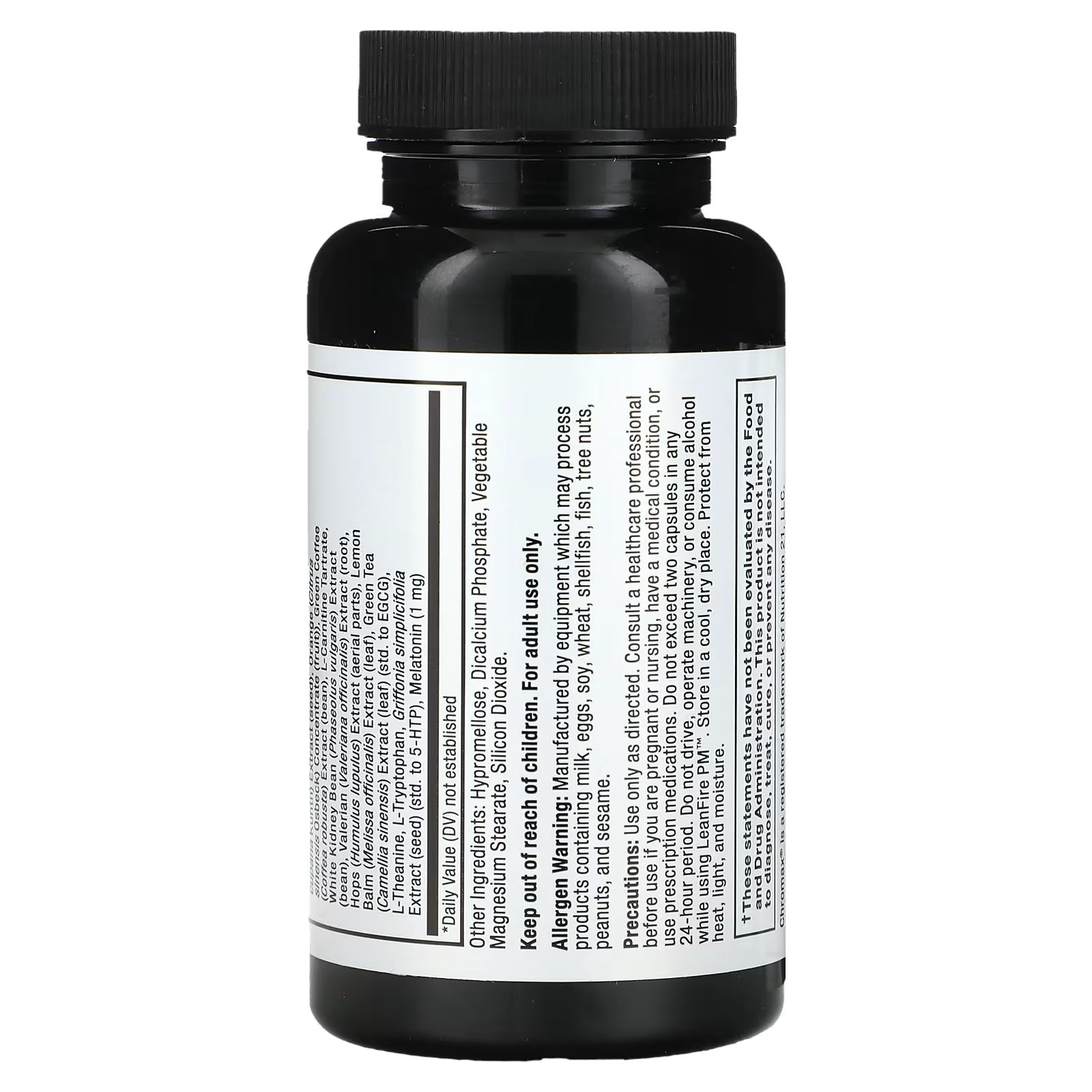 Use only as directed. Consult a healthcare professional before use if you are pregnant or nursing, have a medical condition, or use prescription medications. Do not exceed two capsules in any 24-hour period. Do not drive, operate machinery, or consume alcohol while using LeanFire PM™. Store in a cool, dry place. Protect from heat, light, and moisture.