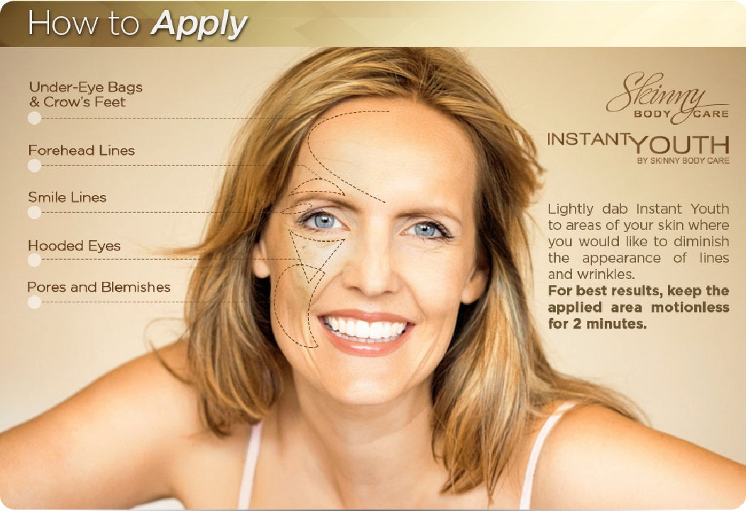 Simply dab Instant Youth on areas of your skin where you would like to diminish the appearance of lines and wrinkles, let dry, and see results almost immediately!