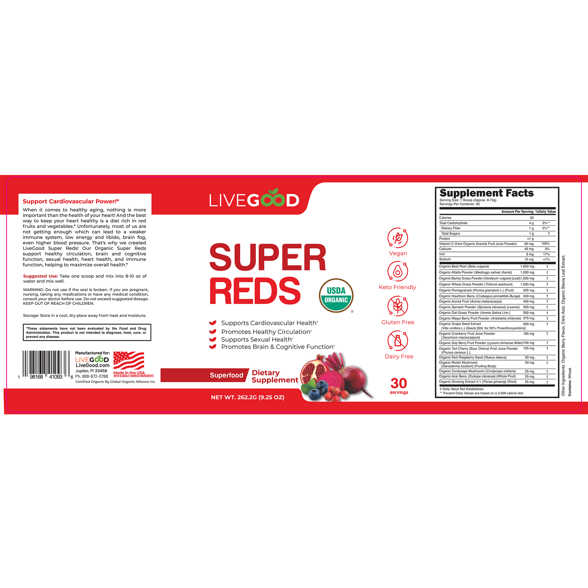 That's why we created LiveGood Super Reds! Our Organic Super Reds contain the highest amount of fruit and vegetable extracts known to help improve blood flow by increasing our body's production of Nitric Oxide, boosting blood circulation, supporting brain and cognitive function, sexual health, heart health, immune function and helping to maximize your body's overall health!