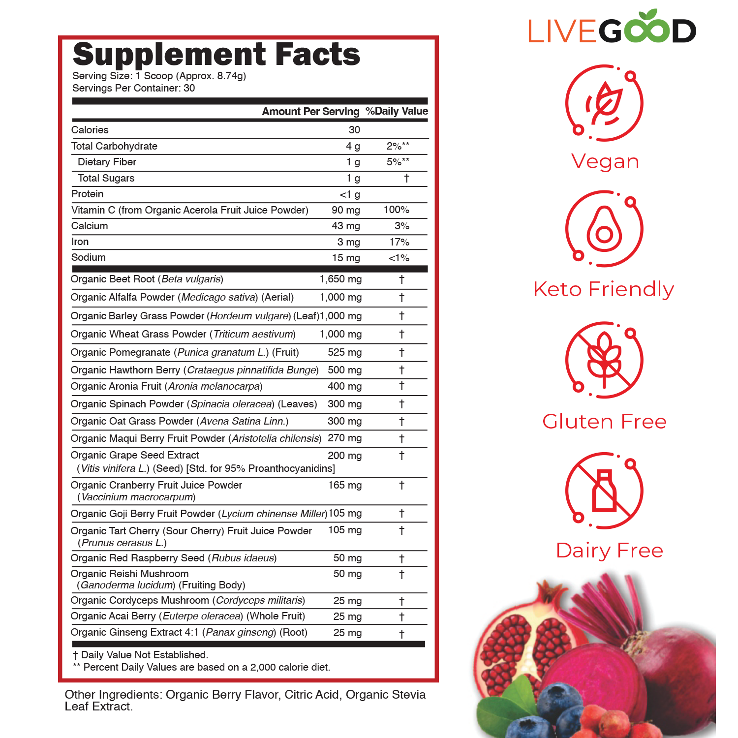 When to take it: We often drink 2 servings of red powder per day because we love it so much. Since Organic Super Reds help increase Nitric Oxide which helps increase blood circulation, we like to use this as a pre-workout or an afternoon pick-me-up. If mixing as a pre-workout, consider mixing with the LiveGood Essential Aminos Fruit Punch flavor for the ultimate pump. It mixes and tastes great with just water on ice, so please consider it as a substitute for juice or soda.